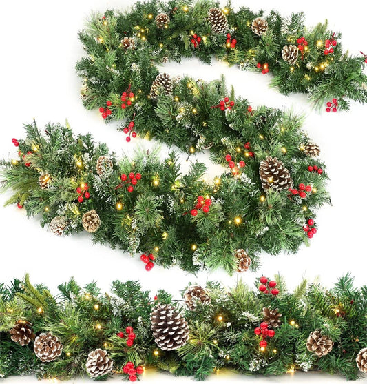 9Ft Christmas LED Pre Lit Garland Snow Flocked Artificial Wreath Xmas Decora