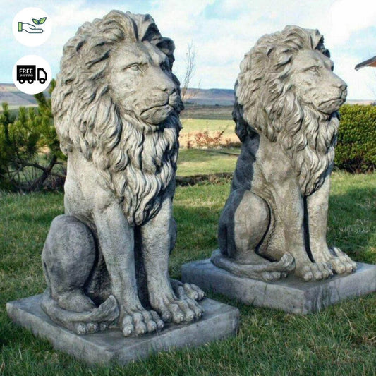 Pair Large Proud Lions Heavy Stone Cast Garden Statues by DGS UK 330KGS