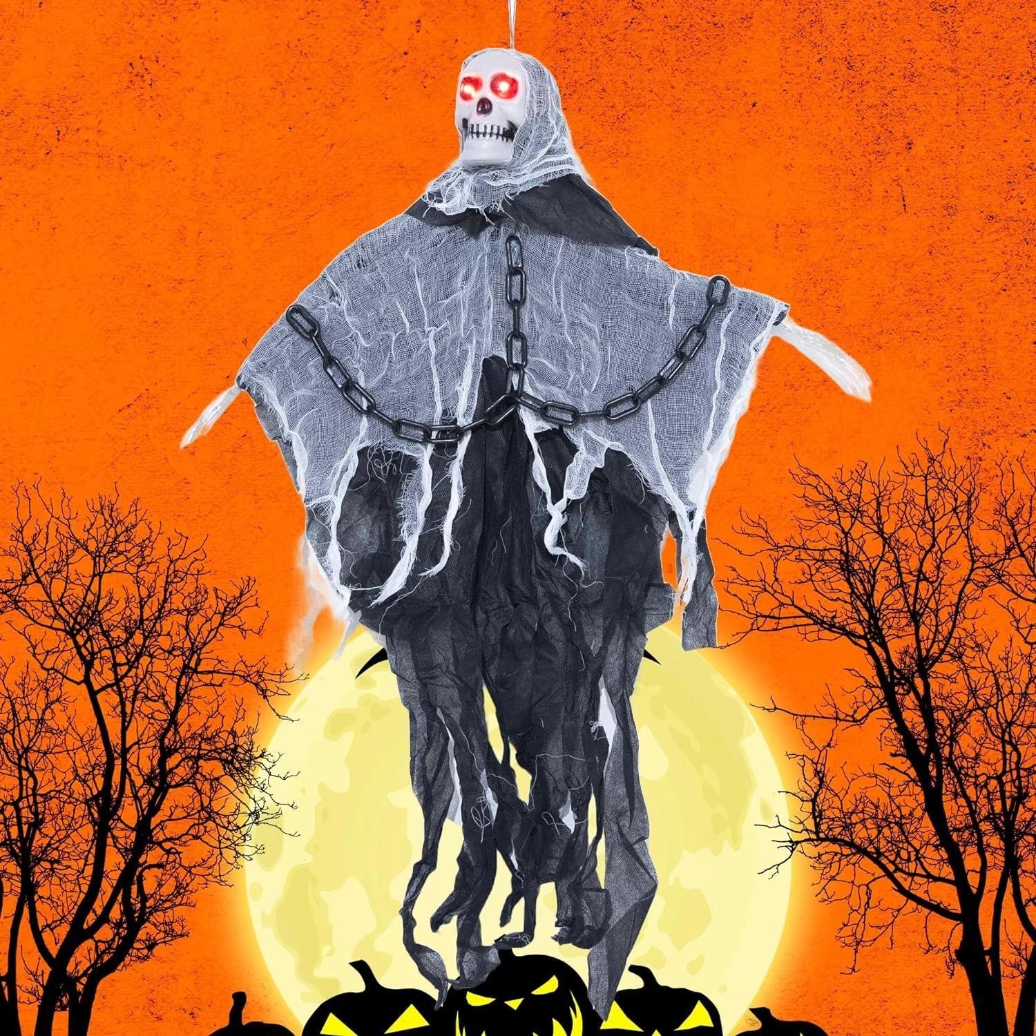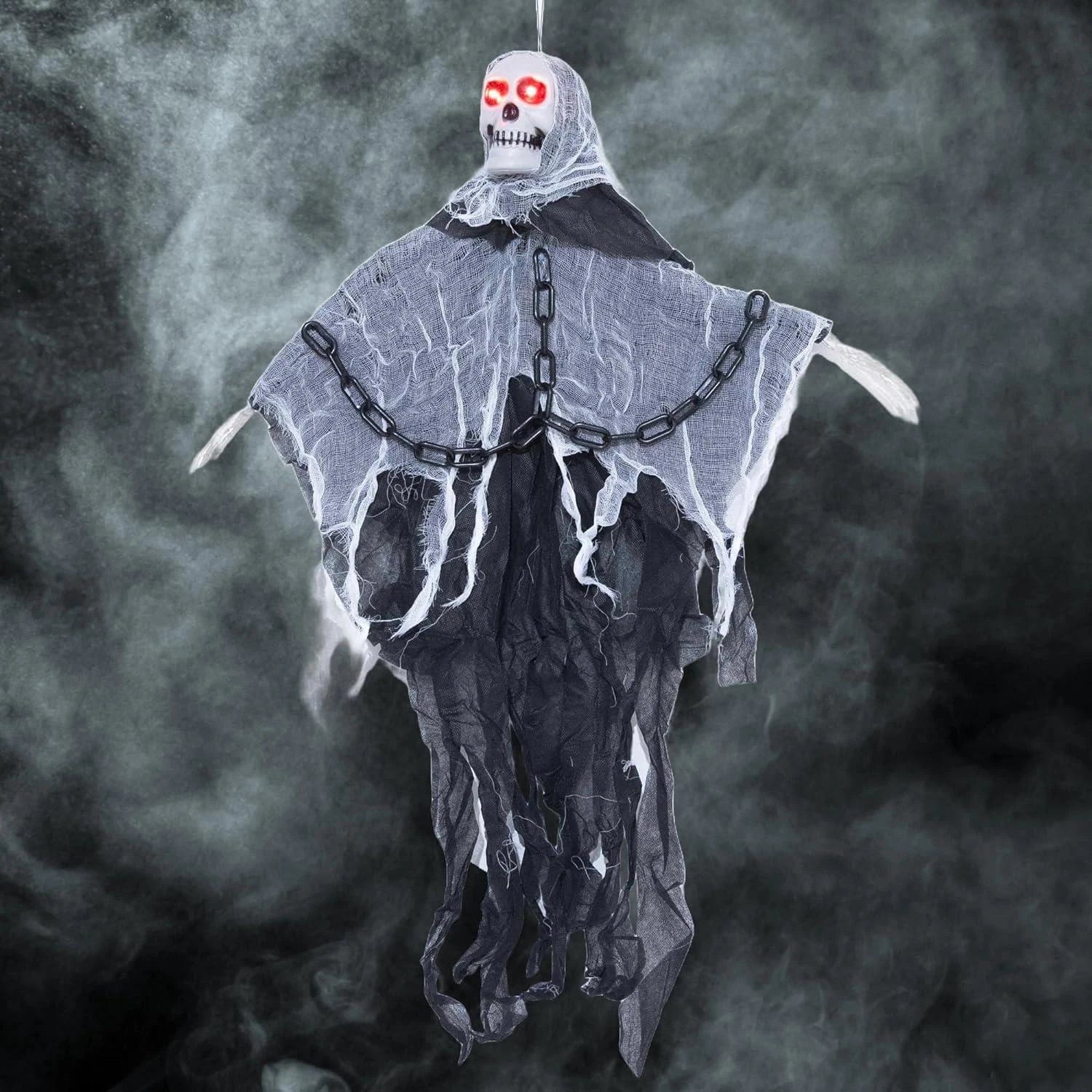 This bone-chilling addition to your haunted house setup stands at an imposing 90cm/3ft tall, complete with eerie chains and shackles. Whether suspended from tall trees, walls, balconies, porches, windows, or eaves, it immediately transforms your atmosphere into one of terror. Perfect for adding a scare to your Halloween festivities. 🌲🏡🎃
