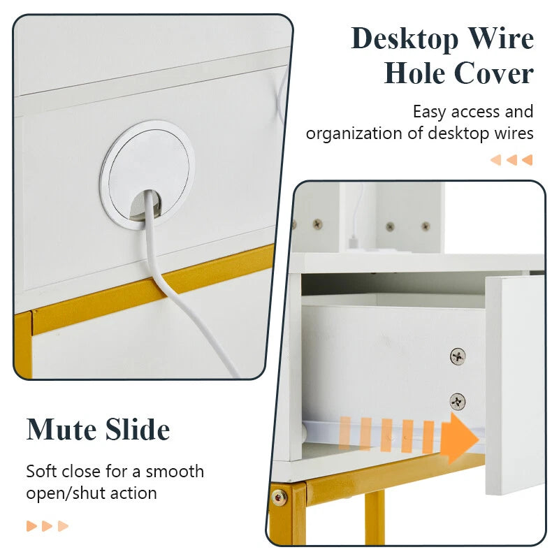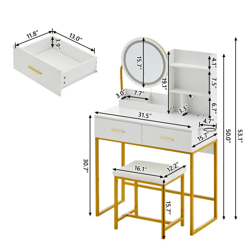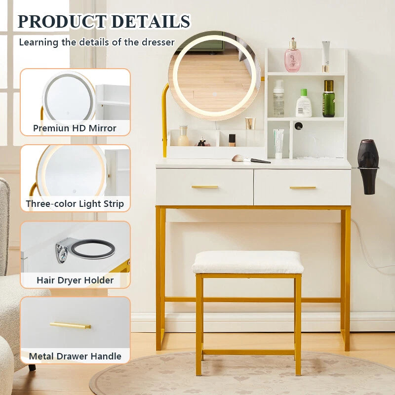 Dressing Table Round Mirror LED Lights Stool Vanity Table Makeup Desk Gold Leg