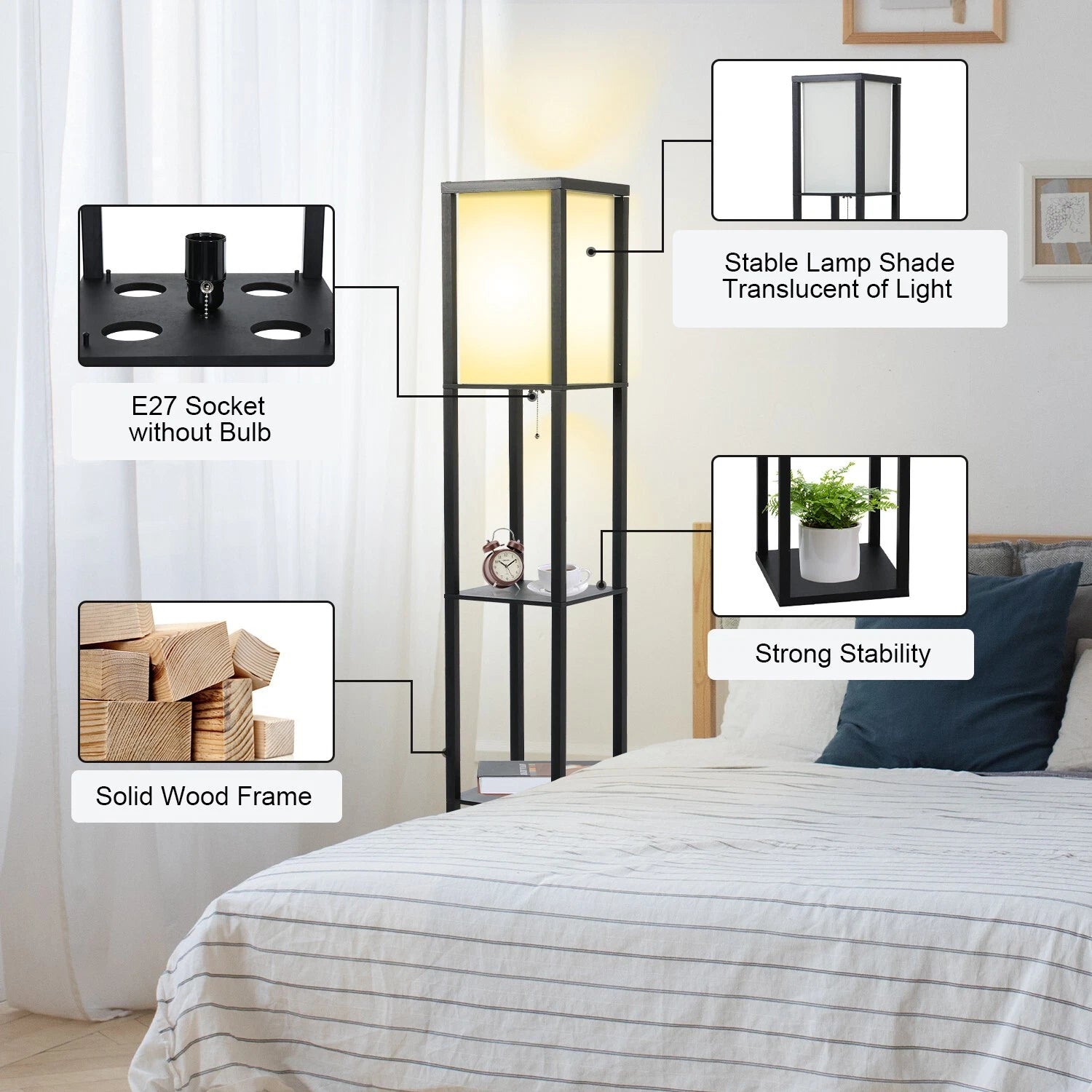 Floor Lamp Free Standing Wood 3-Tier Storage Shelf Reading Bedroom Living Room
