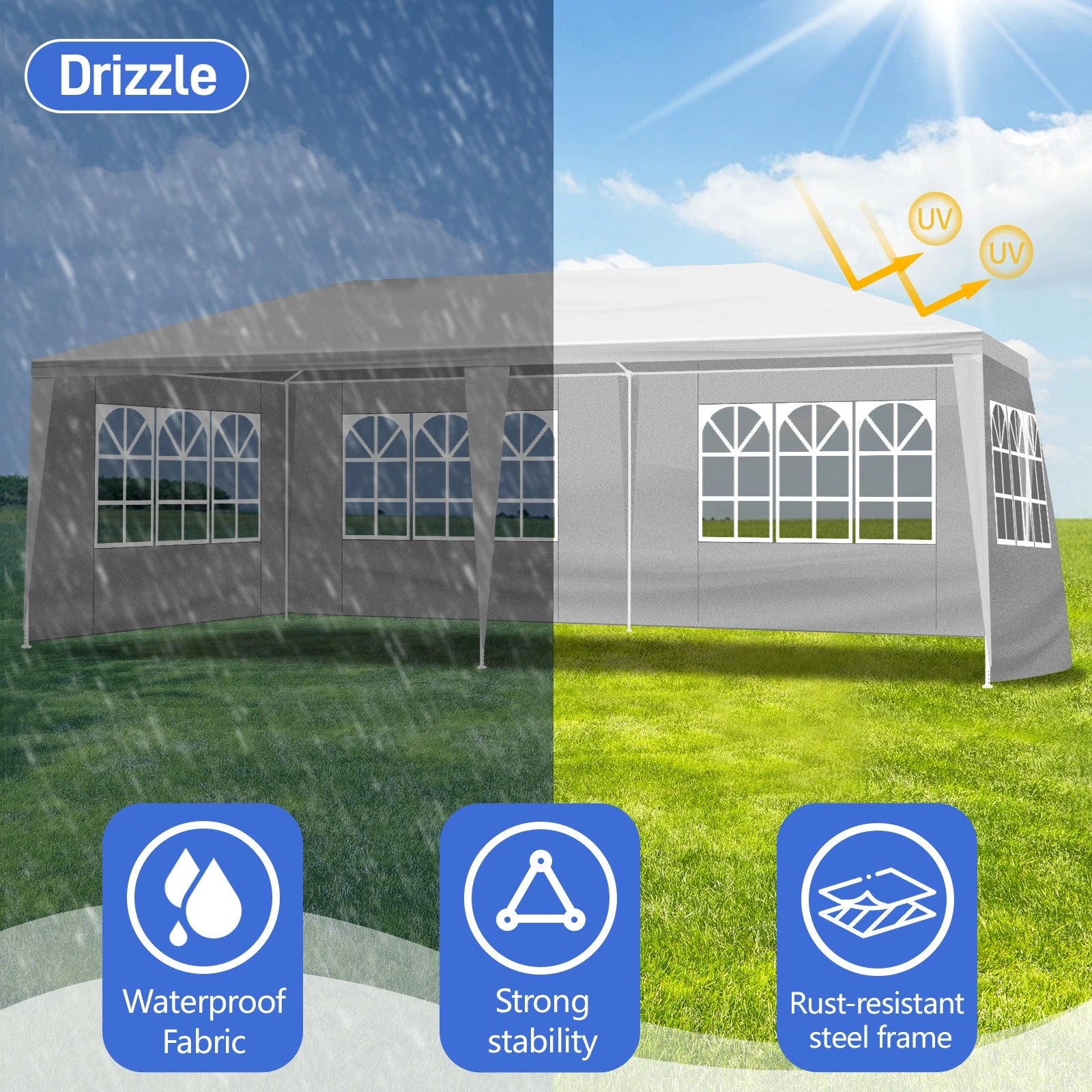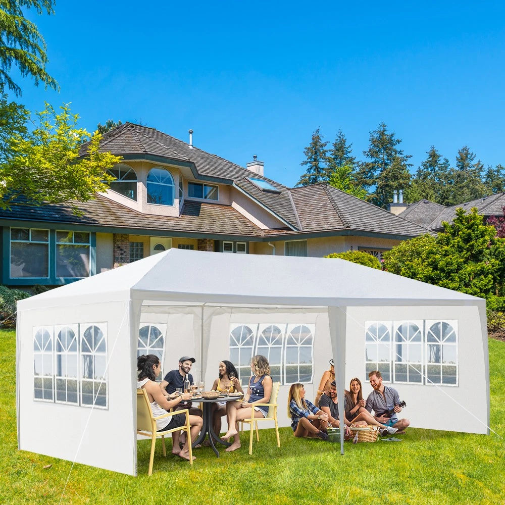 Complete your party with this spacious and versatile Outdoor Party Tent! It is definitely a must-have for a party in your backyard or for a commercial event outdoors. Our outdoor party tent offers shelter from the sun rays and light rain, so as to provide the perfect space for serving food and drink. And the tent is a wonderful choice to add party atmosphere that will put all of your guests in the mood to celebrate. Removable sidewalls allow you to leave open sides as many as you want.