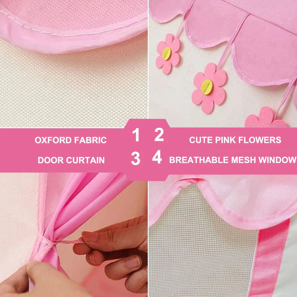 The pink kids play tent is designed in the shape of a castle, with flowers, butterflies and cotton ball light, providing a space for children to play.
