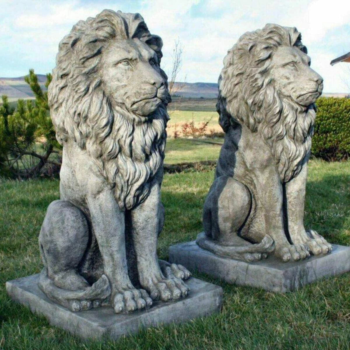 Pair Large Proud Lions Heavy Stone Cast Garden Statues by DGS UK 330KGS