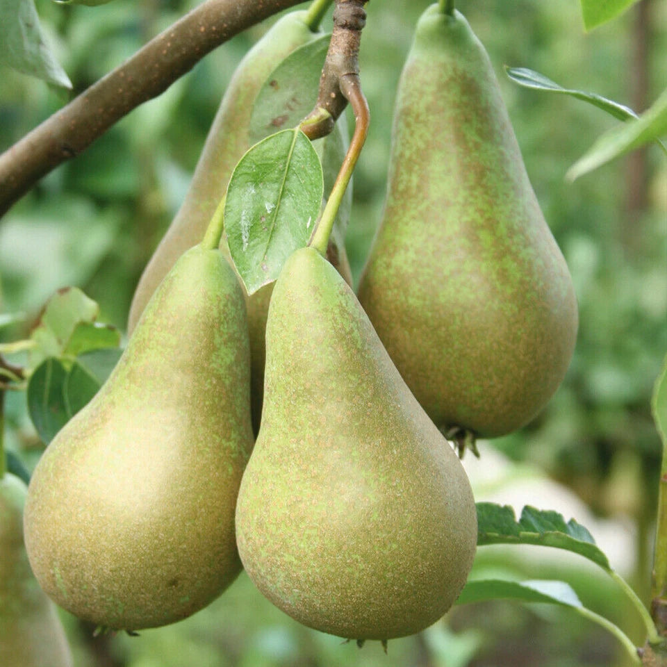 Pear (Pyrus) Mini 'Conference' - a delicious dessert pear which is also brilliant when cooked, producing large, bell-shaped fruits with green skin and a juicy flavour.