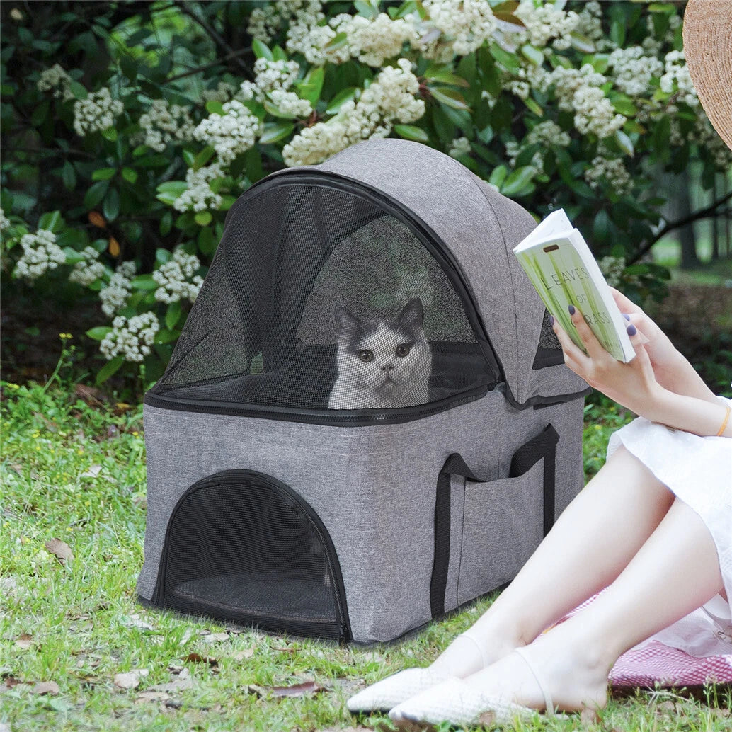 A well-constructed cat stroller with a weight capacity of 20kg (max do not exceed 30kg), designed breathable mesh cover offers maximum visibility and continuous airflow. The storage basket you can hold some supplies. Safety lock wheels prevent accidental movement.